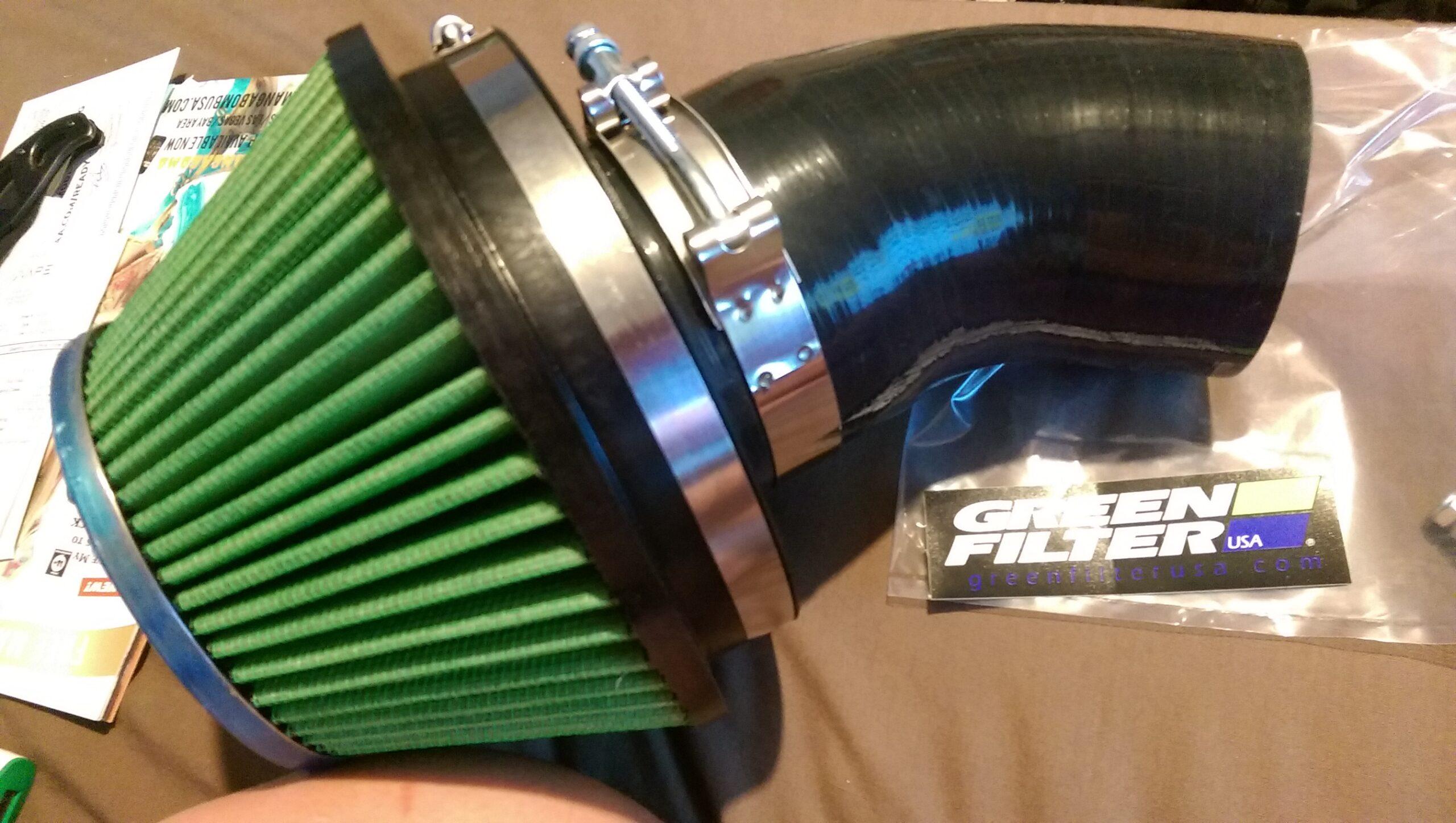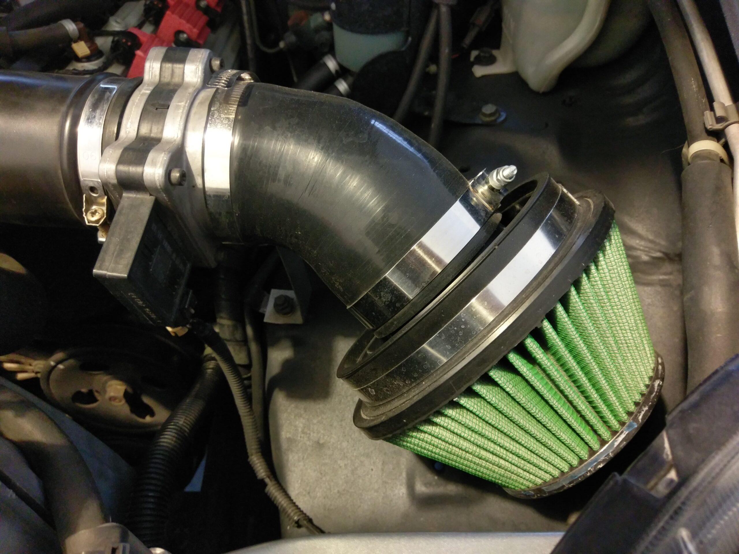 Upgraded my filter from a cheap Spectre cone filter to a new Green Filter 2383 Green High Performance Air Filter. This is mated to a Skunk2 343-99-0500 Black 3.5″ Composite Velocity Stack and then into a 45 degree silicone hose reducer. Right now I’m still using the stock intake hose, but eventually I would like to upgrade that to a carbon fiber or aluminum intake pipe.